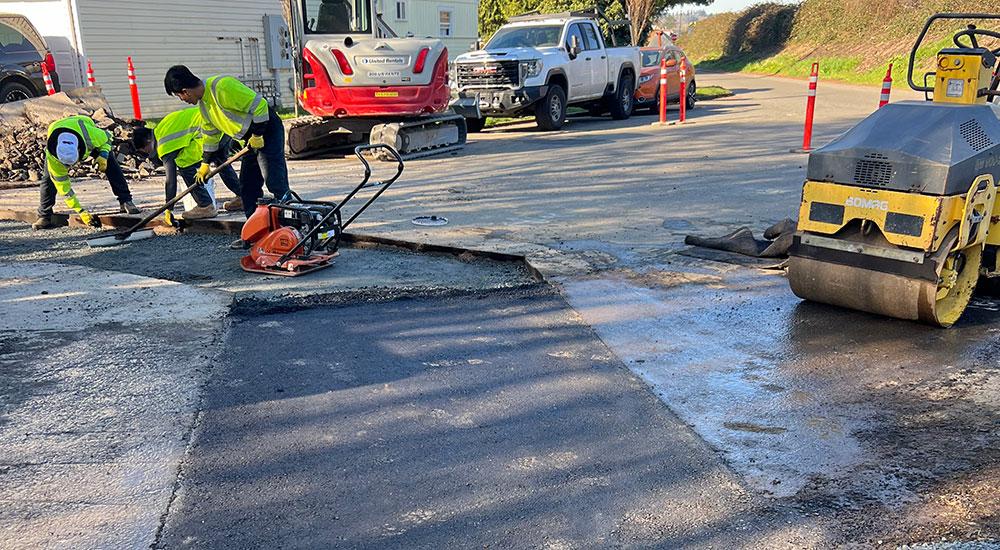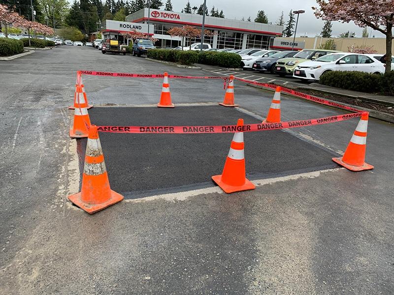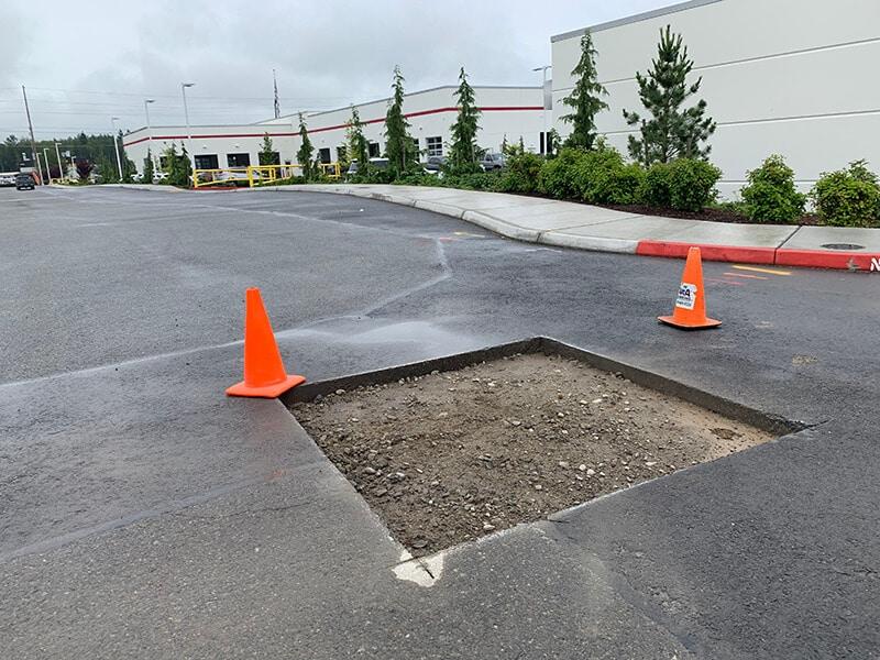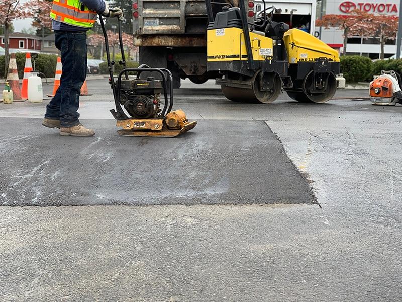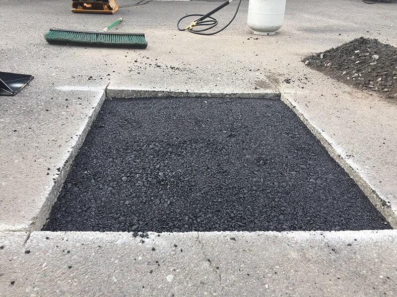 Asphalt patching is a cheaper alternative in areas where the asphalt has cracked, but the base is still stable, or in areas where potholes have occurred. This process begins by cleaning the repair area and applying a tack coat to help the new asphalt adhere to the existing surface. A layer of asphalt is then installed upon the existing surface; the depth will vary depending on the severity of the existing damage. Patching is more affordable; however it will not last nearly as long as removal.